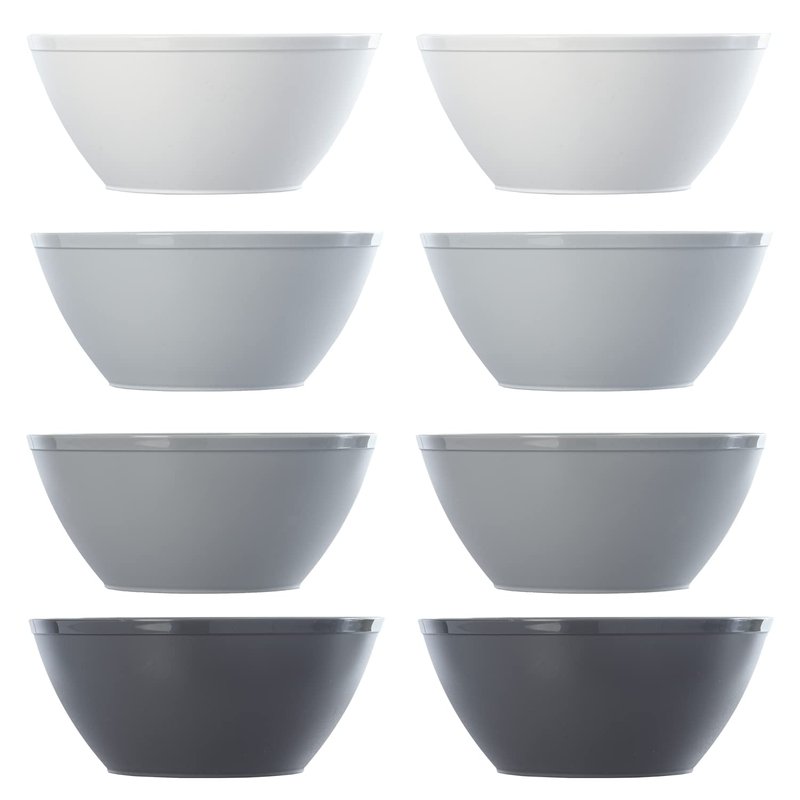 These are the perfect little cereal bowls for busy mornings! Great for serving individual salads alongside the main entrée. A great bowl for pasta or noodle bowls. A quick and complete solution for your next outdoor party. Reduces waste, and eliminates the need for disposable dinnerware. These perfect grey shades will fit into many party themes and décor. Movie night? Set up a buffet full of snacks and let everyone fill their own bowl with goodies to take to the couch. Versatile enough to be used every day and durable enough for use by the pool. The perfect break-resistant bowl set for the new college student or first apartment. These bowls are a fun addition to any new kitchen. They nest and stack neatly for easy storage in kitchen cabinets. A step up from disposable dinnerware, they are also great for the patio or picnic. They won't shatter or crack like glass if dropped. Set of eight 28-ounce bowls in shades of grey. Cleans easily on the top rack of the dishwasher. They are BPA-free and made in the USA.