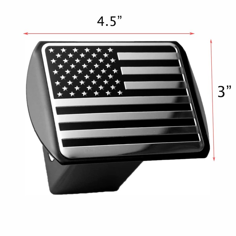USA US American Embossed 3D Black and Chrome Flag on Black Trailer Metal Hitch Cover Fits 2" Receivers. Made of Carbon Steel and powder coated black finish. Front plate is 4.5x3 inches Fits standard 2" trailer hitch receivers, - Stainless steel Anti-ruttle Pin/Bolt included.
