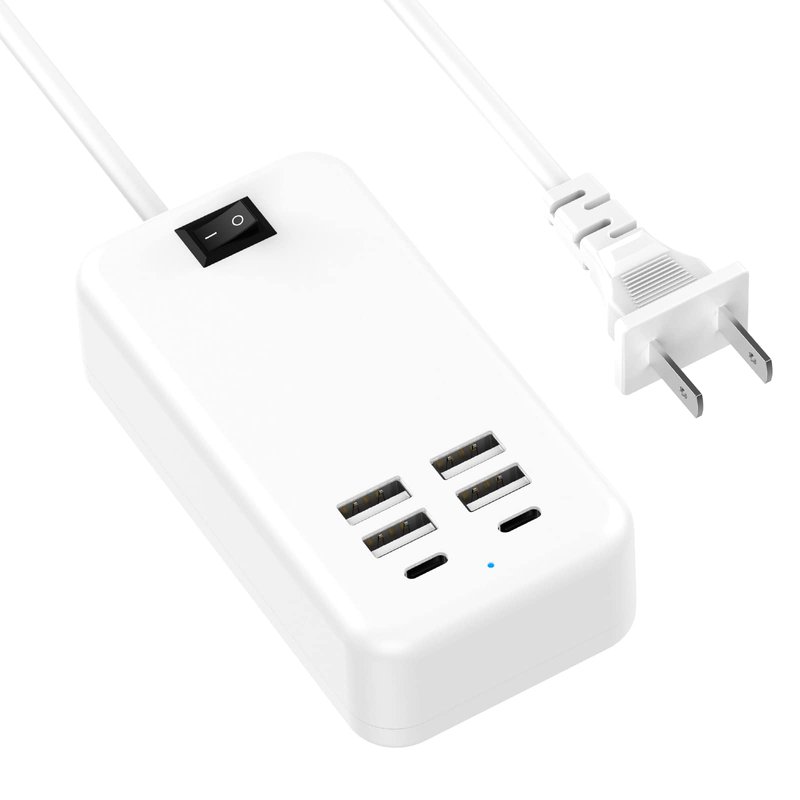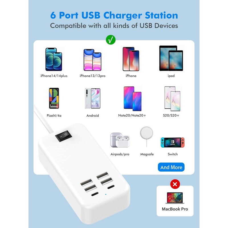 - [Charging USB Power Strip] Our usb charging hub comes with 4 USB A and 2 USB C which can provide the charge up to 2.4A per port or 6A overall for multiple devices.