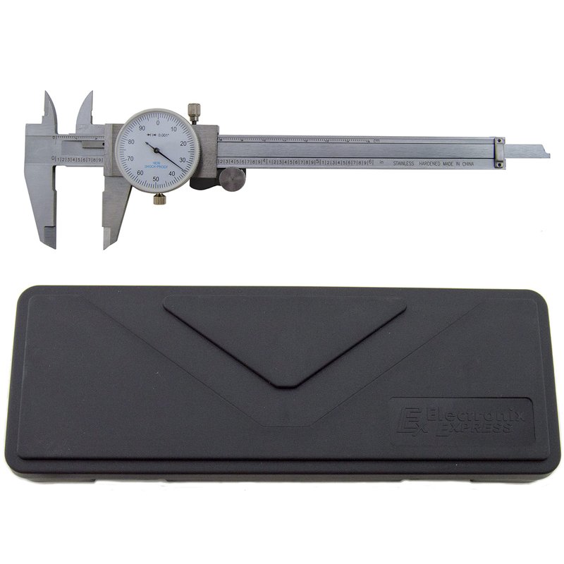 Steel construction caliper 6" dial, Precision Ground Jaws for Accuracy, Jaws Designed for Inside, Outside, and Thread Measurements, Slide Lock Holds Reading in Place. Comes with carrying case.