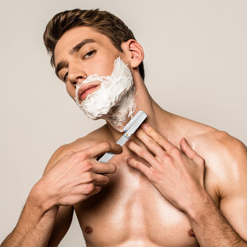 - Smooth Grip – It features a flip-able blade cover with a comfortable metal grip, allowing easy maneuvering and a close shave. Start with gentle strokes and slowly work your way around to keep a steady motion and pressure.