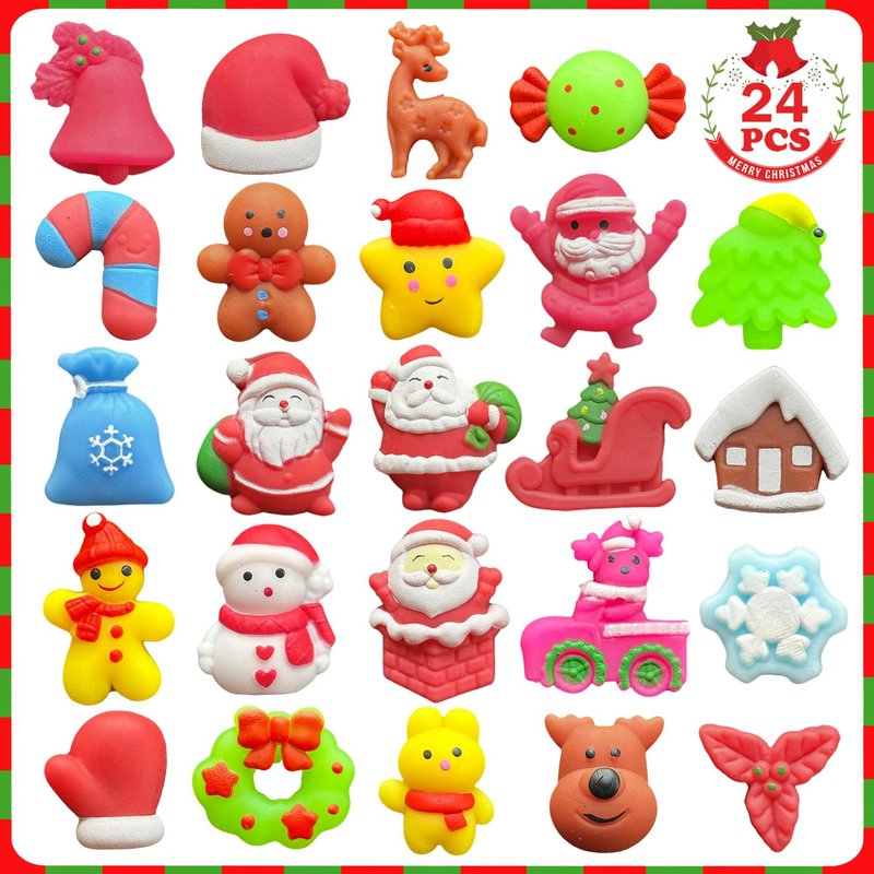 - WHAT YOU GET: Imagine the delight on your little one's face as they discover 24 unique Christmas themed kawaii mochi squishy toys nestled in a beautifully designed festive box. Each toy, a masterpiece of craftsmanship, is individually wrapped in 24 vibrant colors and intricate patterns that capture the essence of the holiday season!