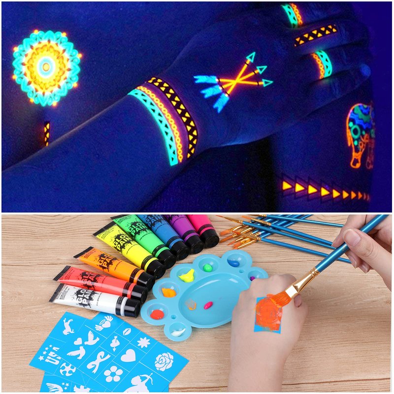 - Glows Brightly under UV Light: This neon paint can glow brightly under UV light at night, there are eight different colors, with brushes and palettes, you can DIY the patterns you want, stand out from the crowd, and be the brightest person in the party. It's also a good choice for Halloween.