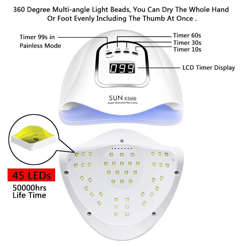- No Hurt Eyes,No Black Hand --- SUNx5max LED nail lamp generate daylight non-ultraviolet white light safe for eyes. Say goodbye to outdated single UV lamps causing troubles with blackened hands and no harm for our eyes. And the nail dryer lamp is also lightweight, small, portable for travel. You can change your nail color according to your tourist destination or travel mood anytime.