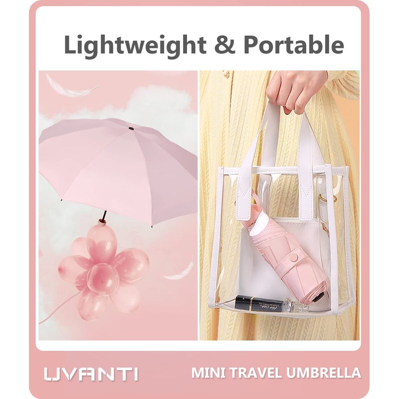 - 【Lightweight & Compact】Our travel umbrella is only weight 8.2 ounces. Measuring only 7 inches which is incredibly lightweight making it ultra-portable and easy to carry around. This small umbrella is almost the same size as a mobile phone. This compact umbrella for travel is suitable for backpack, handbag, purse and pockets. You can easily take this small umbrella for backpack with you wherever you go.