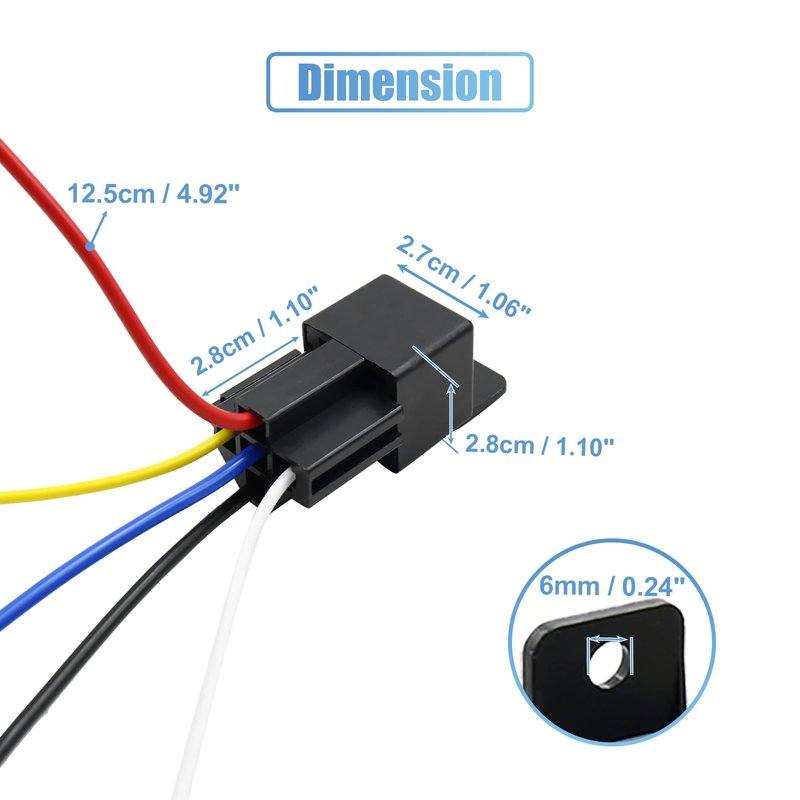 Wire Specifications: Black-Power Input(Pin 30),White-Positive(Pin 85) ,Yellow-Negative(Pin 86),Red-Normally Open Output(Pin 87),Blue-Normally Closed Output(Pin 87a)