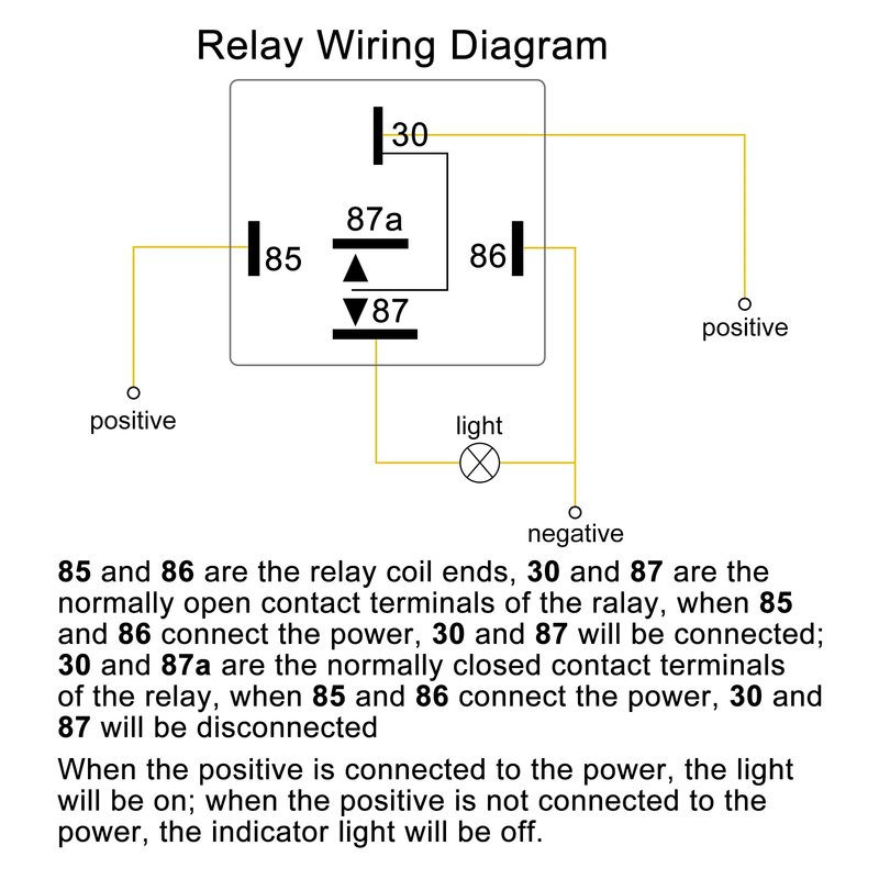 85 and 86 are the relay coil ends, 30 and 87 are the normally open contact terminals of the relay, when 85 and 86 connect the power, 30 and 87 will be connected.30 and 87a are the normally closed contact terminals of the relay,when 85 and 86 connect the power, 30 and 87 will be disconnected. When the positive is connected to the power, the light will be on; when the positive is not connected to the power, the indicator light will be off.