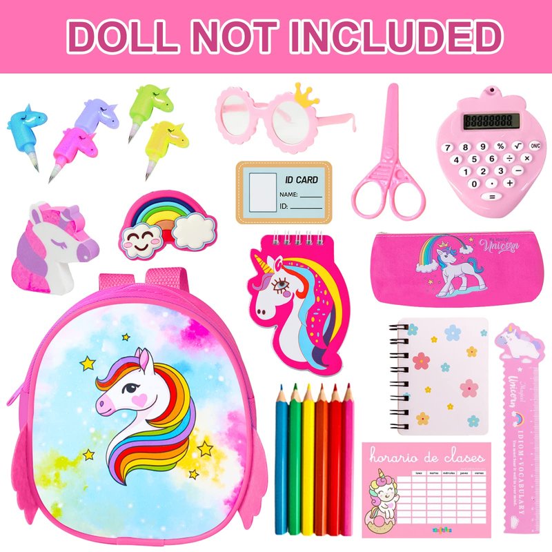 This gift box contains, Dress, Glasses, Class Schedule Card, Calculator, Pencil bag, Pencil*6, Unicorn Notepaper, Notebook, Pencil Sharpener, Scissors, Eraser, Schoolbag, Ball-point pen*6, Name Card, Ruler, (NO DOLL).