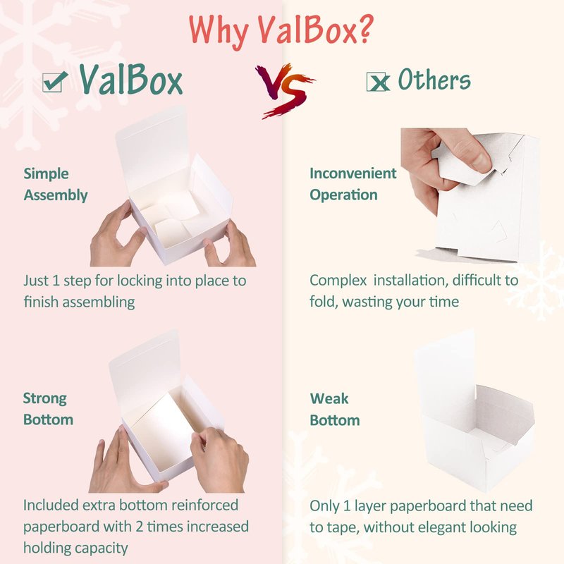 "About ValBox. Engaged in producing envelopes, paper boxes and other home and office paper products supplies, Valbox is a direct-sale store of a paper products manufacture. We advocate the love and natural concept, insisting on using recycled material in the process of production. Hope Valbox can provide you, our valued customers, the high quality products and intimate service. ValBox 4x4x4 Inches White Paper Gift Boxes Made of 100% virgin natural kraft paperboard, Valbox paper gift boxes are fully recyclable, reusable and practical. Easy to assemble and fold for saving your time to use and storage. Made from sturdy cardboard material. No extra tape on bottom needed. Valbox cube paper boxes are the top quality choice if you need your boxes to be sturdy and hold their shape. Share love and make fun in your life. You must love these charming rustic little boxes, which are perfect for putting homemake cupcakes, cookies inside and giving them as gifts. They look very nice after you decorate and fill them."
