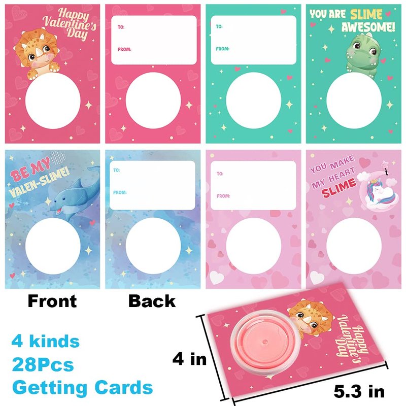 - SUPER DIY DOUGH SET: Our Valentines Day cards with dough slime is ideal Valentines Day gift for kids. The fluffy slime is sealed in a plastic container tub with resealable lid. There are 28 cases of clay in 14 colors with 28 pce of cards in 4 unique designs. Measuring lid 2.36 inches in diameters, cards 5.12 x 3.54 inches.