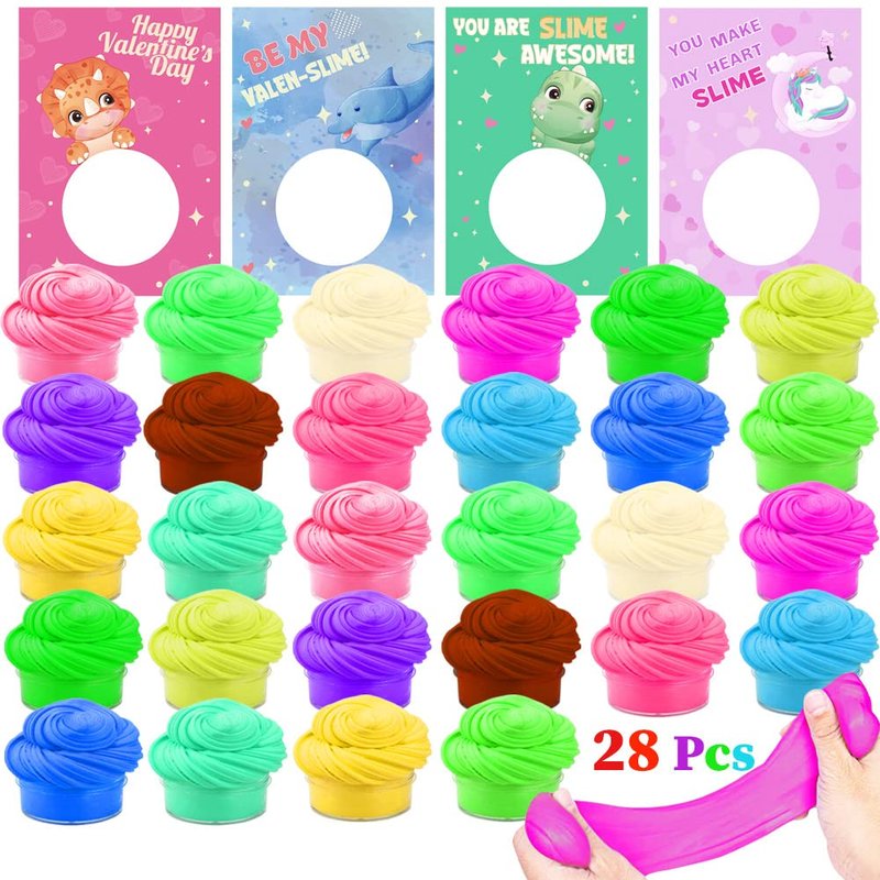 Valentines Day Cards with Colorful Playing Dough, 28 Packs Butter Slime and Valentine's Greeting Cards Gift Sets for Kids, Valentine School Classroom Prize Exchange, Fluffy Putty Party Favors