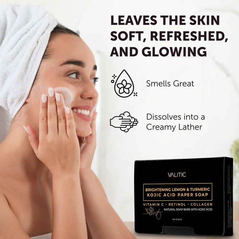 VALITIC Brightening Lemon Turmeric Kojic Acid Paper Soap - Vitamin C, Retinol, Collagen - Original Japanese Complex - Hyaluronic Acid, Vitamin E, Shea Butter, Castile Olive Oil - 2 Pack