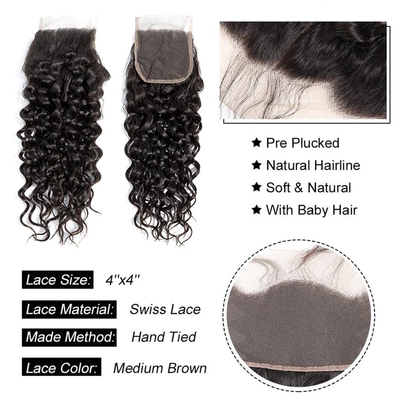 - 【Water Wave Bundles with Closure Material】100% Unprocessed Brazilian Virgin Water Wave Human Hair Bundles with 4x4 Lace Closure.All the Hair Extensions is Cut from Young Girls Directly ,No Synthetic or Animal Hair Mixed.