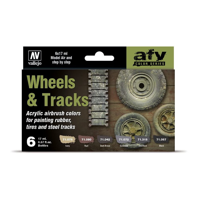 - Acrylicos Vallejo Wheels & Tracks, Model Air Paint Set, 1/2 Fl. Oz. Bottles, 6 Colors