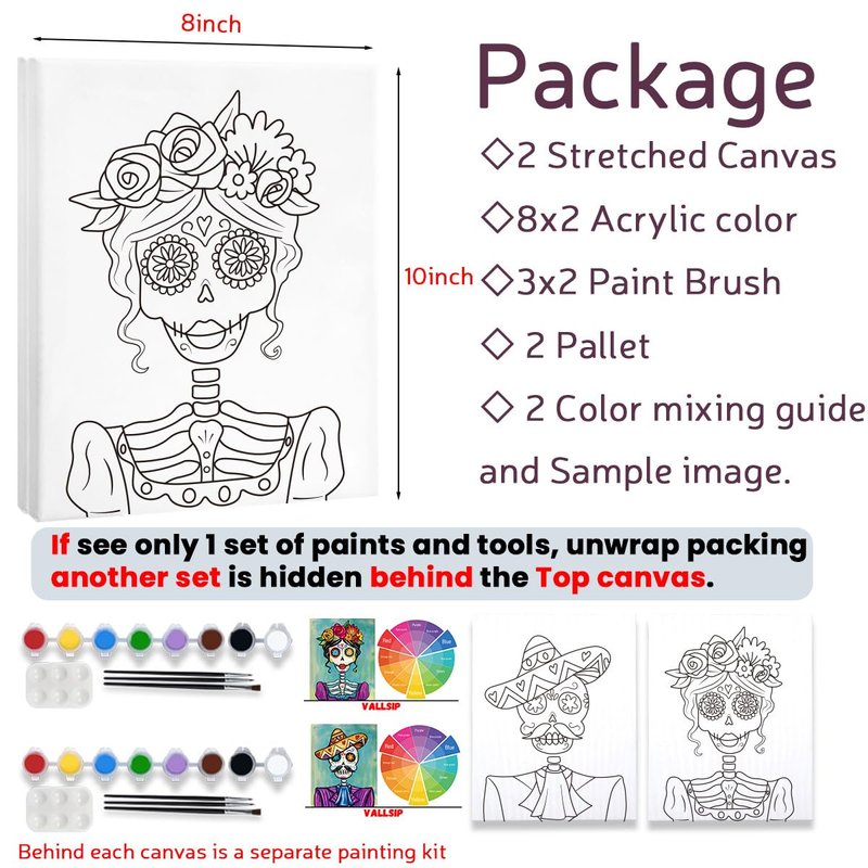 VALLSIP 2 Pack Paint and Sip Canvas Painting Kit Pre Drawn Canvas for Painting for adults Stretched Canvas Couples Games Date Night Anniversary Gifts Paint Party Supplies Favor Day of the Dead (8x10)