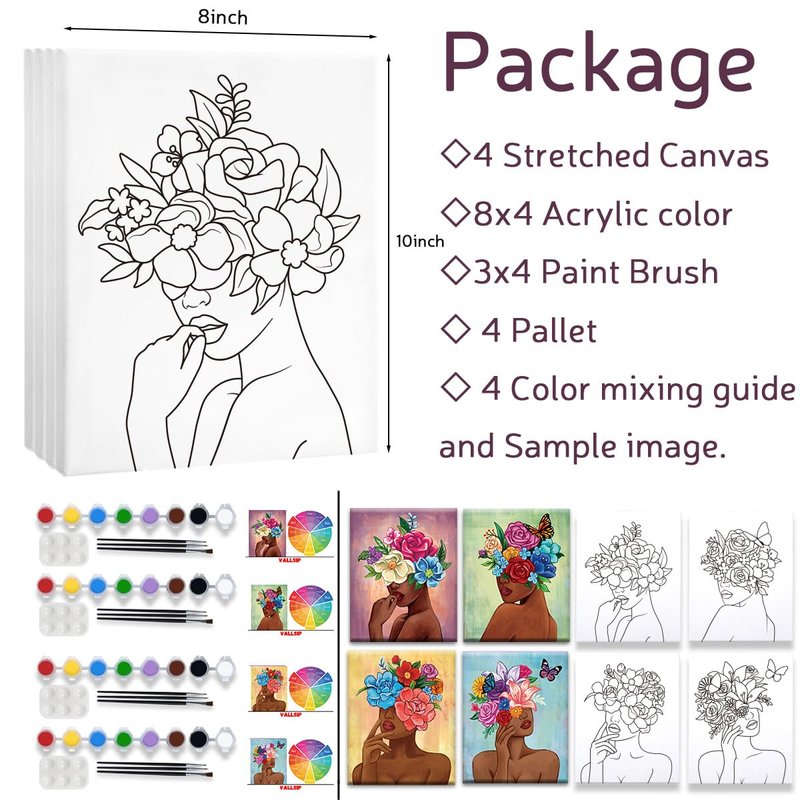 VALLSIP 4 Pack Pre Drawn Canvas for Painting for Adults Paint and Sip Party Supplies Canvas Painting Kits Stretched Canvas to Paint Games Anniversary Gifts Ladies Night Flowers Girl Art Set(8x10)