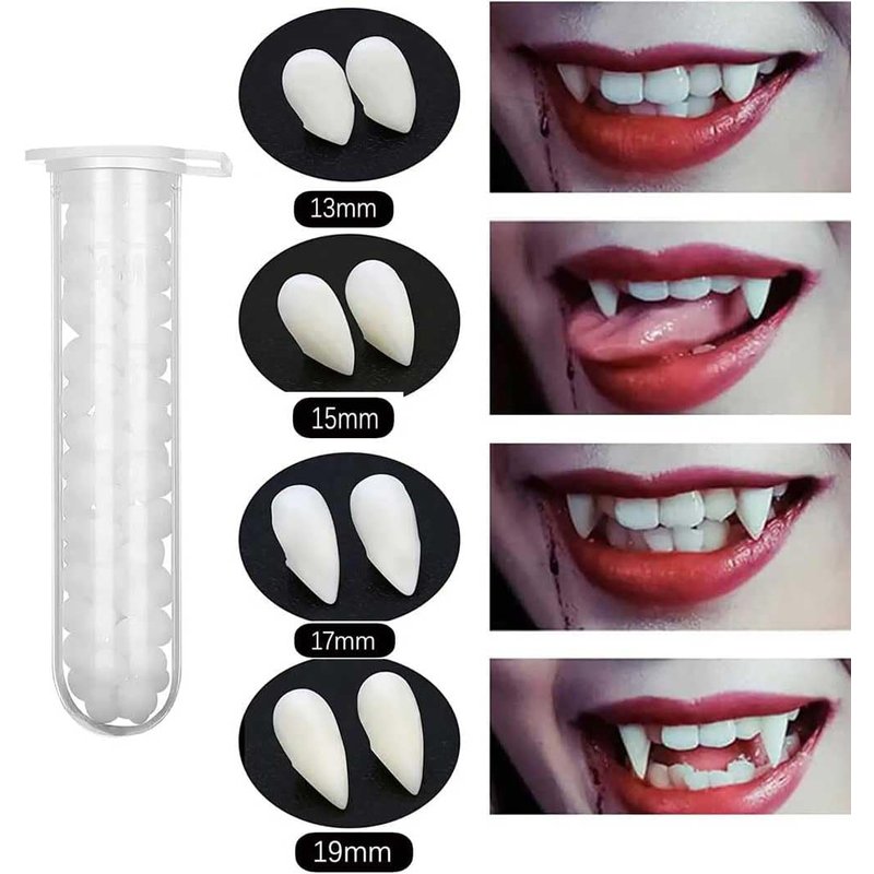 - Optional size custom fangs: there are 4 sizes vampire dentures in this horror false teeth set, 13 mm, 15 mm, 17 mm, 19 mm, meet your different cosplay needs.
