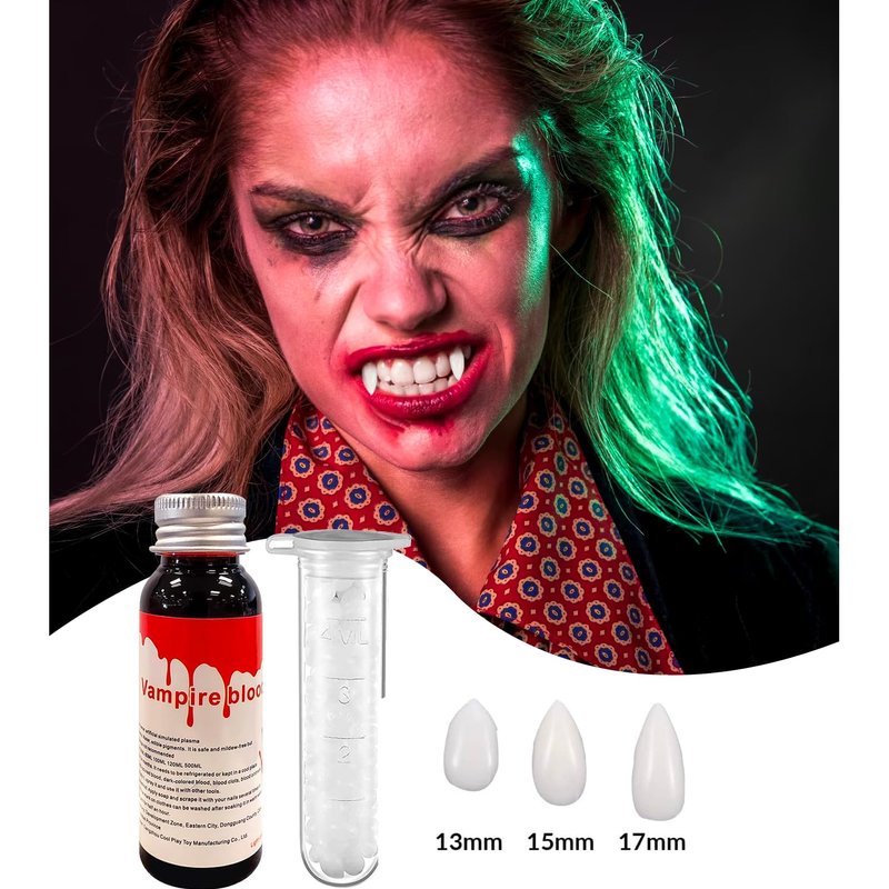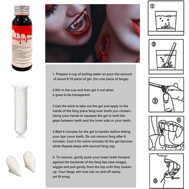 Quantity: 6 Piece Vampire Tooth Horror False Teeth with1 tube teeth pellets with 1 Oz Vampire Blood Gel with 1 Pair of Tweezers