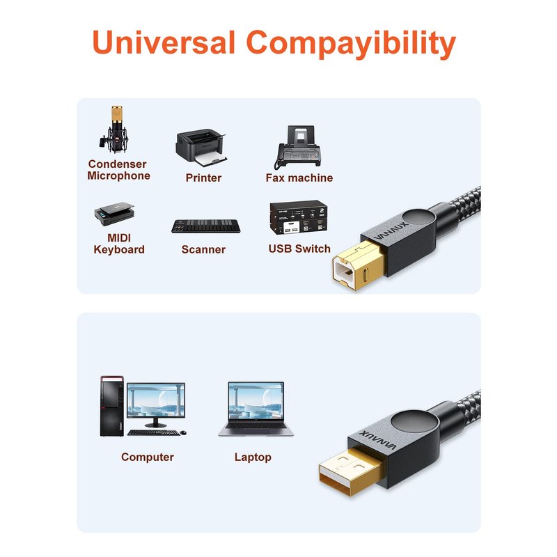 - Universal Compatibility:VANAUX USB 2.0 B printer cable is ideal for connecting your scanner, printer, server, hard drive, camera, piano, and other USB b devices to a laptop, computer, or other USB-enabled devices for data transfer.