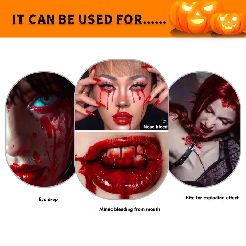 - Halloween Blood Makeup:Realistic fresh fake blood super soft and sticky stage blood.Ideal for creating a range of realistic and fresh looking injuries.It continues to drip,so it's great for eye blood,eye drops and nosebleeds.The fake blood capsule is filled with powder,open the capsule and pour the powder into your mouth,it will melt quickly to form realistic fake blood (It made of starch and coloring,recommended not to swallow)