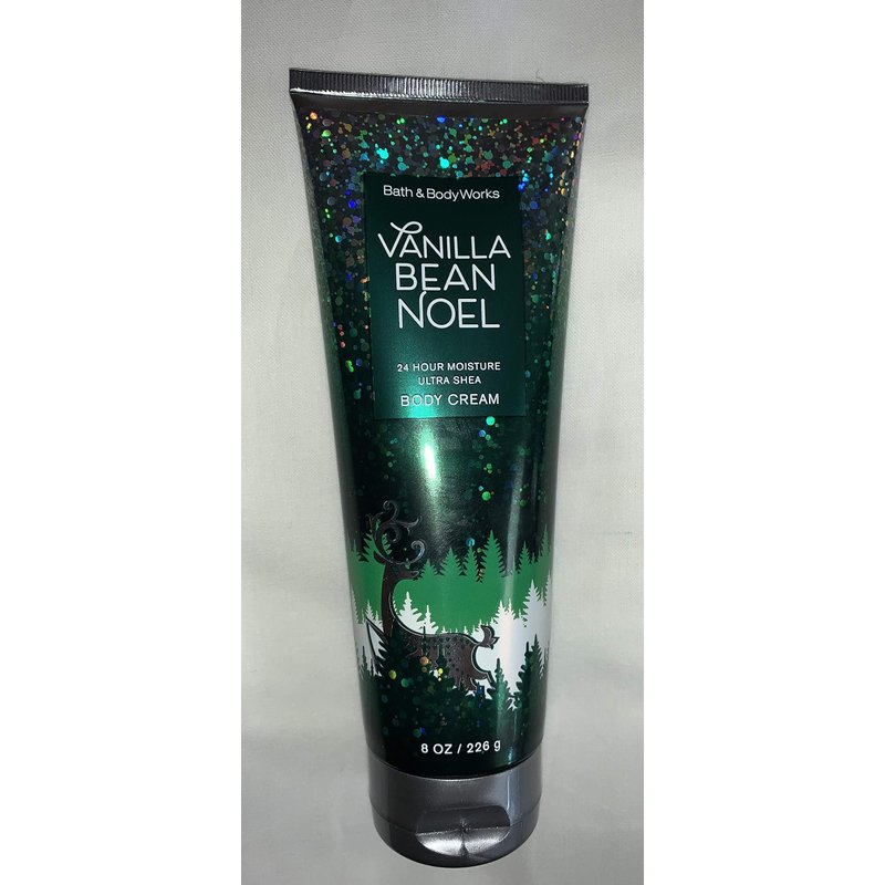 Bath and Body Works Vanilla Bean Noel Body Cream 8 Oz. Scent: vanilla bean, caramel, sugar cookies and whipped cream. Ingredients: (natural essential oils, vitamin E, aloe, shea butter, cocoa butter and hyaluronic acid) Dermatologist tested (Bottle Design May Vary)
