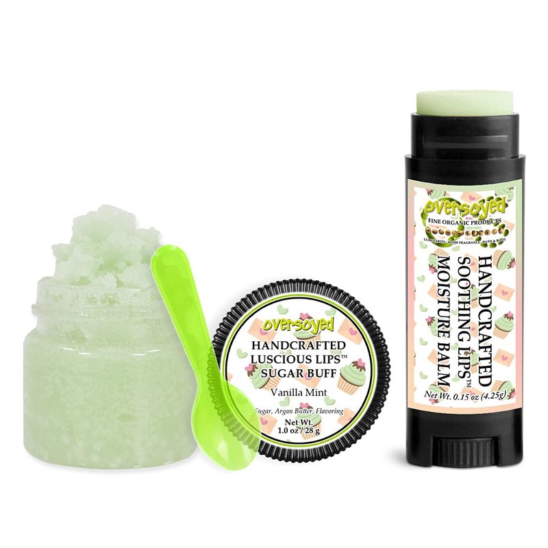 Vanilla Mint Soothing & Luscious Lips by OverSoyed Exfoliator & Chapped Lip Repair Lip Care Combo | Artisan Handcrafted to Order Refreshing Mint Sweet Vanilla Flavored Exfoliating Sugar Lip Scrub & Lip Moisturizer Balm Gift Set