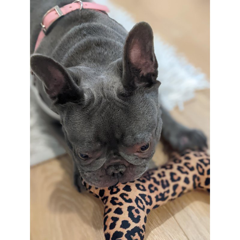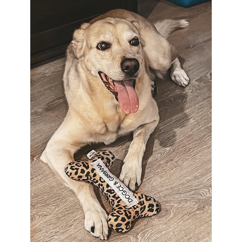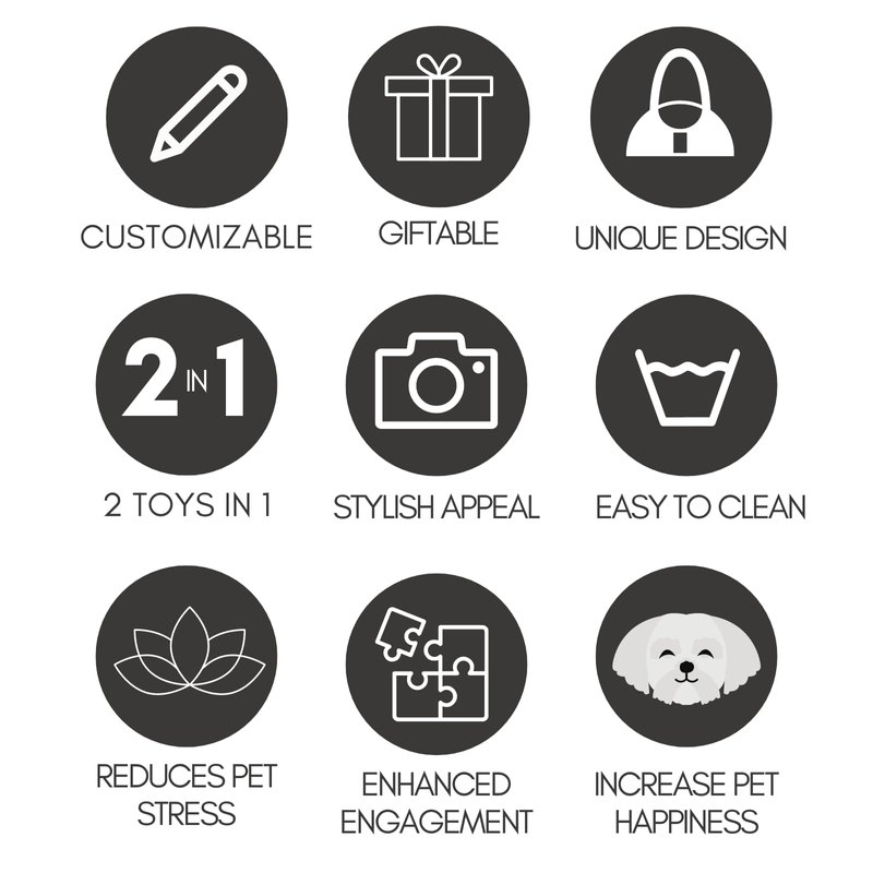 Satisfy your dog's need to play and destroy with a unique, stylish 2-in-1 toy that is fashionable on the outside with added function on the inside. The trendy embroidered, soft plush exterior has fluffy polyester stuffing, a built-in squeaker for added engagement, and a small rubber bone inside that keeps the fun going.