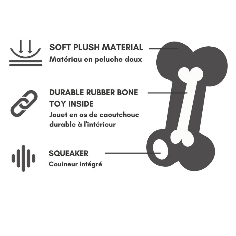 - SUITABLE FOR ALL DOGS – Although the toy can be enjoyed by dogs of all sizes, it is ideal for medium to large dogs. Plush bone size is 8in x 5in (20cm x 13cm) & inside rubber bone 4.5in x 1.25in (11cm x 3cm).