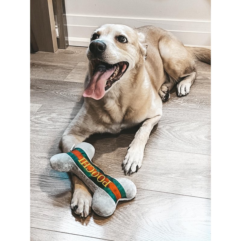 Satisfy your dog's need to play and destroy with a unique, stylish 2-in-1 toy that is fashionable on the outside with added function on the inside. The trendy embroidered, soft plush exterior has fluffy polyester stuffing, a built-in squeaker for added engagement, and a small rubber bone inside that keeps the fun going.