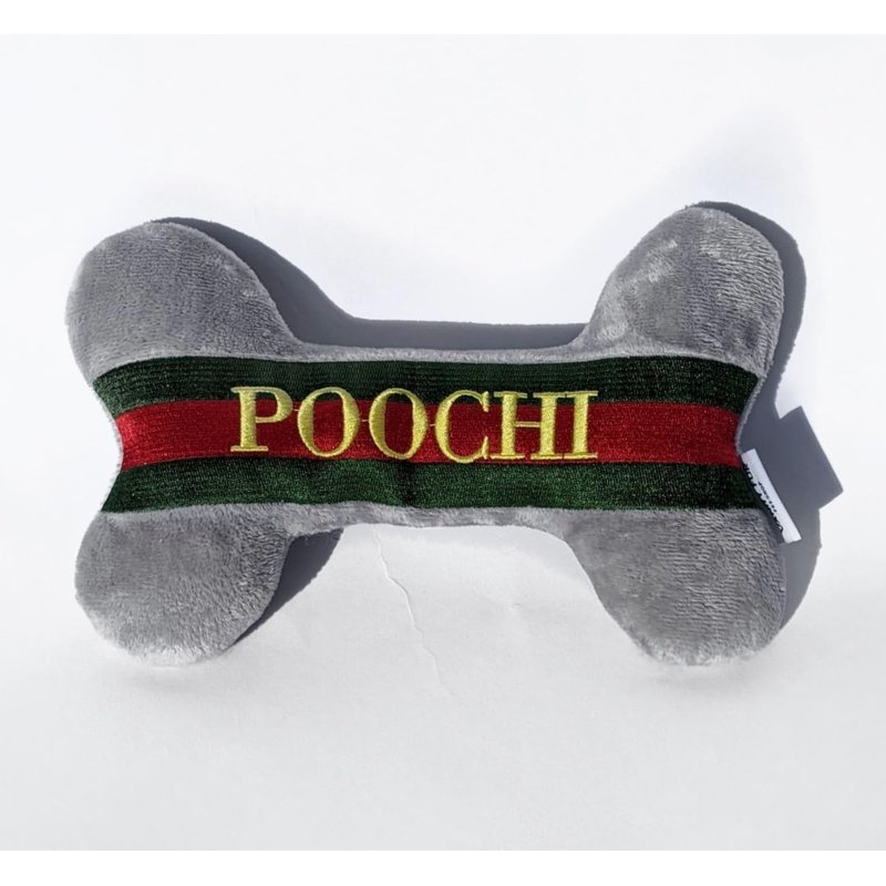 Vanity Fur Pet Shop 2-in-1 Plush Squeaky Dog Toy with Rubber Bone | Interactive & Enrichment Chew Toy for Dogs | Poochi Designer Parody – Grey Fashion | Durable, Stuffed & Squeaker Toy