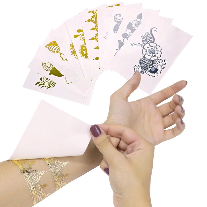 - This packet of fake tattoo essentials includes pink, teal, purple, silver, gold, blue, brown, green, orange, and red metallic pens, enabling you to create art that will ‘wow’ your friends and family alike.