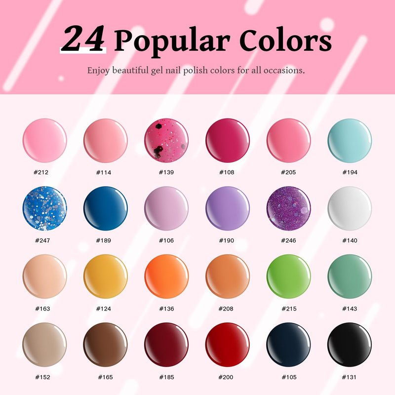 - 【Stylish & Classic Gel Nail Polish Colors】 Hand-picked by VANREESA, the 24 colors in this gel nail kit include the most popular colors of the moment for any occasion or festive event. This gel nail polish set contains nude, pink, red, purple, green, blue, yellow, orange and more, you can choose any color to match and create a unique nail art style. No need to struggle with color choices anymore, this gel nail polish kit contains all the colors you need, come and start your color journey!