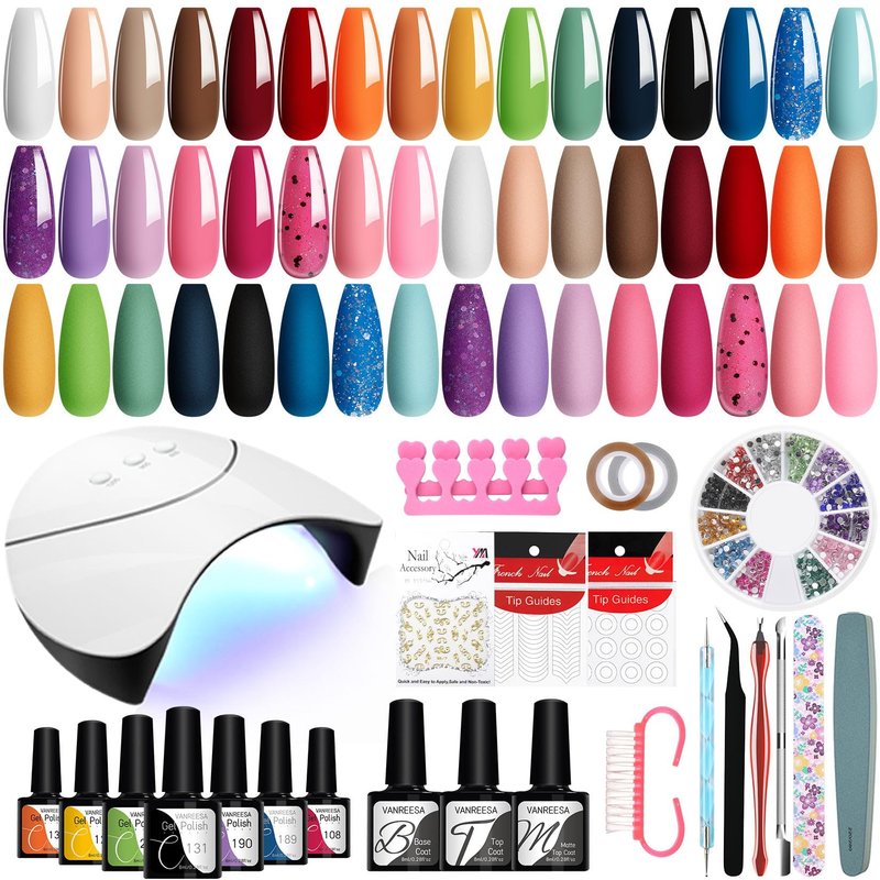 - 【Professional 42 Pcs Gel Nail Kit for Beginners】 VANREESA gel nail polish kit comes in a beautiful gift box and contains 24 bottles of 8ml gel nail polish, 8ml base coat, glossy & matte 8ml top coat, 36W nail lamp, essential manicure tools and some beautiful nail art decorations. This gel nail polish kit with u v light contains all the necessary tools for both professionals and hobbyists to easily enjoy their own manicure at home!
