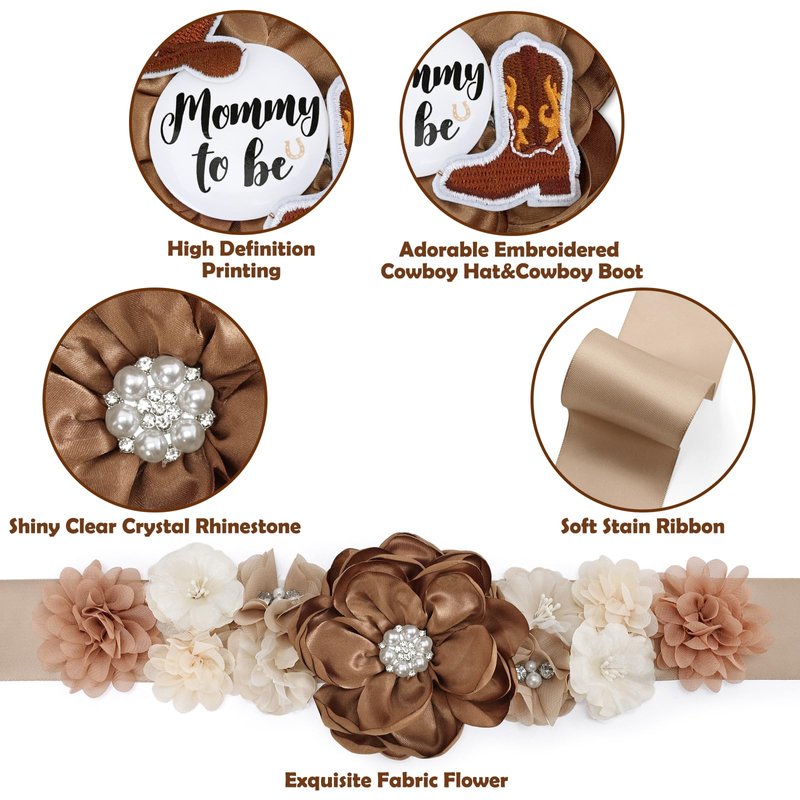 - Exquisite & Adorable - Handmade with embroidered cowboy hats, cowboy boots, and cow print ribbons, these corsage pins are the epitome of charm. The western-themed maternity sash features eleven fabric flowers in beige, brown, and ivory, adorned with delicate pearls and rhinestones.