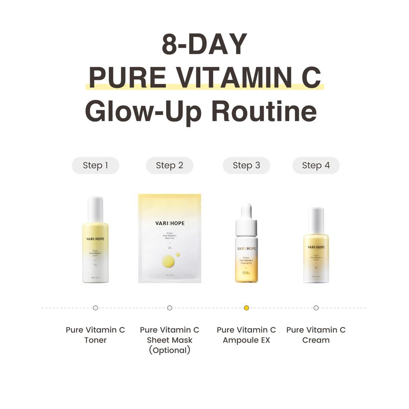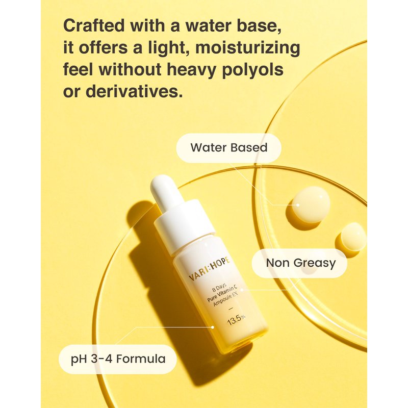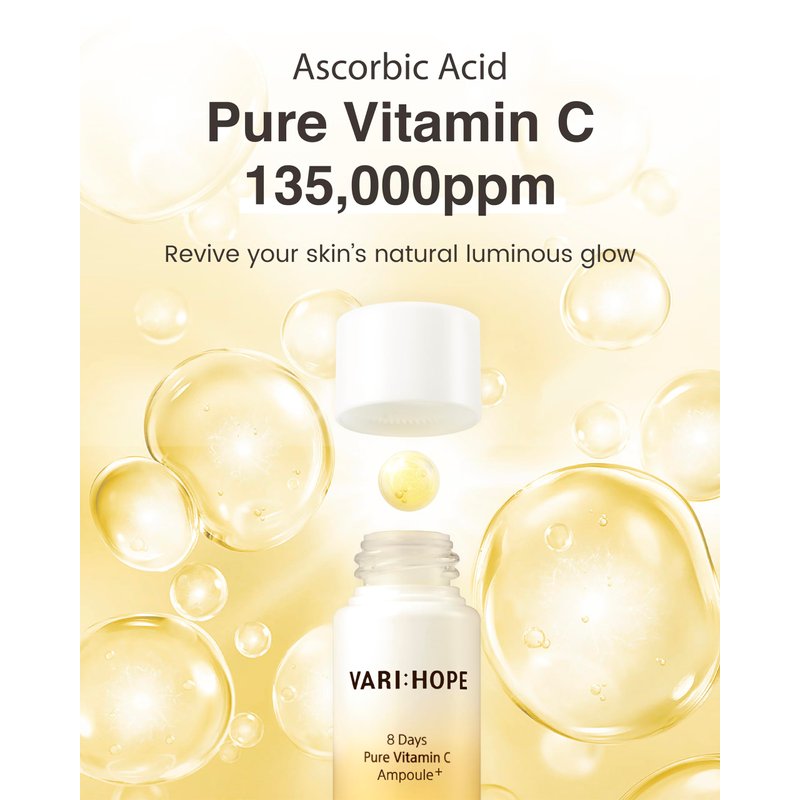 - VARIHOPE 8 DAYS PURE VITAMIN C AMPOULE EX (15g/0.5oz) - A highly concentrated Vitamin C serum formulated with 135,000ppm pure ascorbic acid. It supports skin brightening and reduces the appearance of uneven tone, helping to enhance the skin's natural radiance in just 8 days. Ideal for targeting areas of concern and promoting a smoother, more luminous complexion.