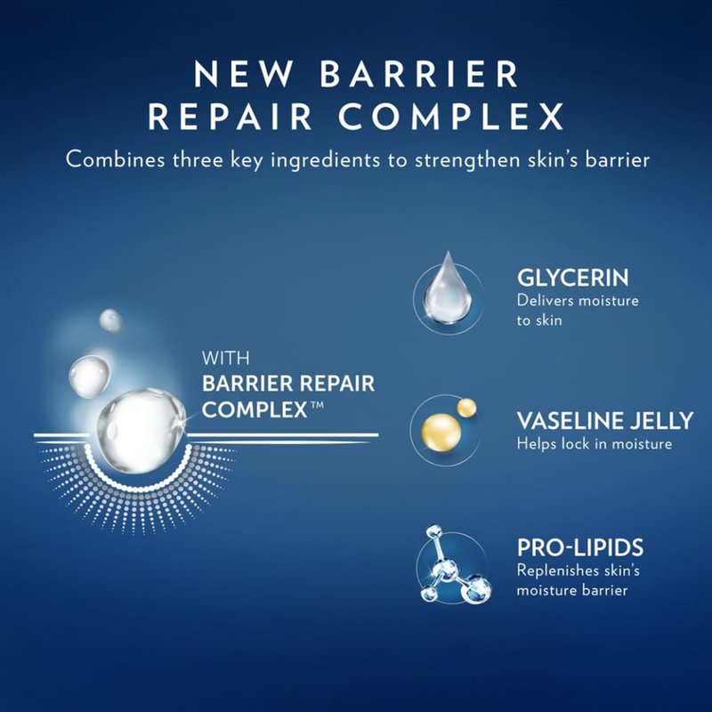 - BARRIER RESTORE COMPLEX: Infused with microdroplets of Vaseline petroleum jelly – an occlusive that locks in lasting moisture – the deeply moisturizing lotion restores the skin barrier.