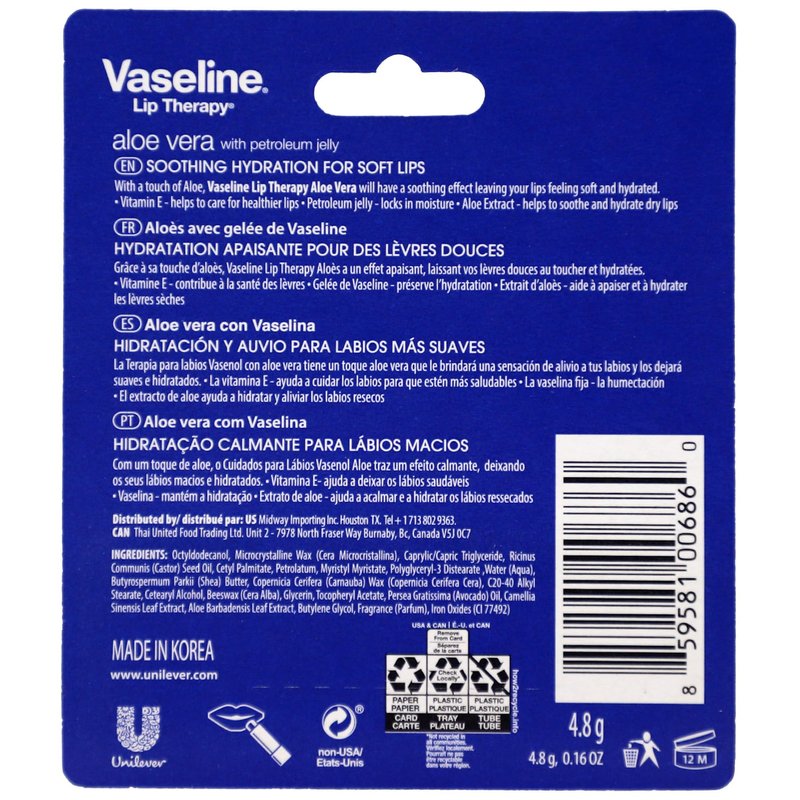 - Soothes and Hydrates: Vaseline Lip Therapy with a touch of Aloe Vera soothes, leaving your lips feeling soft and hydrated while providing the essential moisturization your lips need.