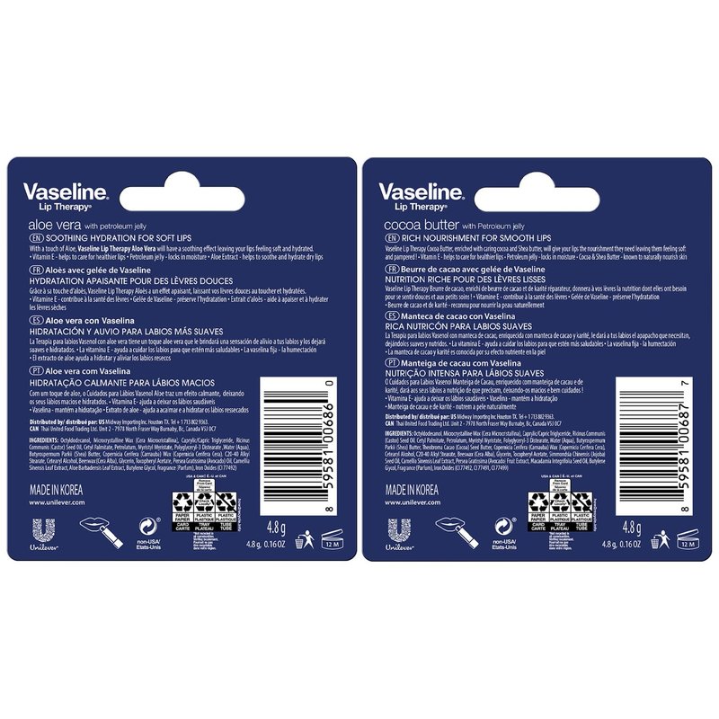 - VASELINE LIP BALM: Enjoy two Original and two Aloe Vera lip balm sticks crafted with Vaseline Healing Jelly.