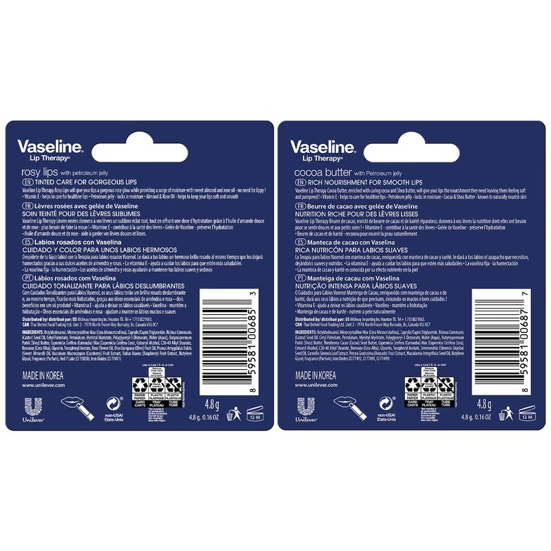 - VASELINE LIP BALM: Enjoy two Cocoa Butter and two Rosy lip balm sticks crafted with Vaseline Healing Jelly.