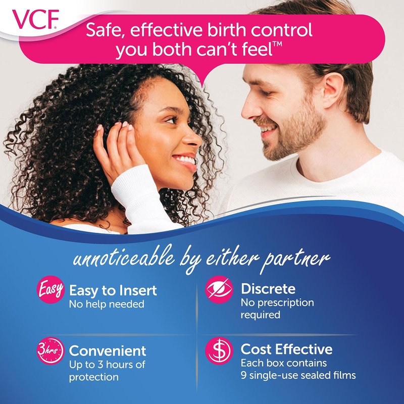 - Highly Effective - VCF Film is soft square film that dissolves with your body’s natural moisture to create a gel barrier that coats the cervix and kills sperm on contact for up to 3 hours