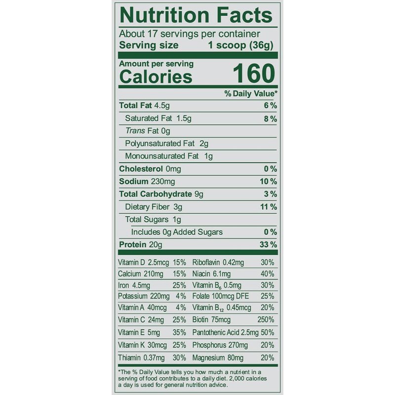 - MORE THAN JUST PROTEIN: 25% DV OF 11 vitamins and minerals per serving, 3g of fiber, 1g of omega-3 ALA and antioxidant vitamin C to help support the immune system. From real, plant-based ingredients to give you a head start on your daily essentials.