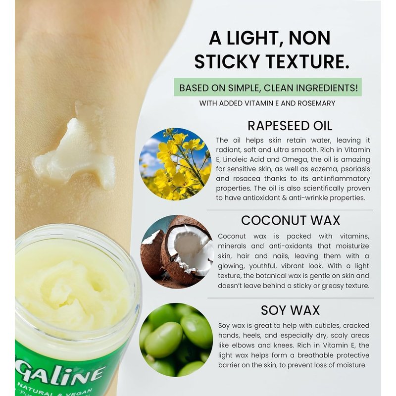 - NON-GREASY, NON-STICKY TEXTURE - Unlike many conventional products that clog pores when used, Vegaline glides onto skin and provides it with much needed moisture while maintaining a light texture. The botanical wax blend creates a protective moisture barrier that your skin can breathe through, leaving skin happy and glowing.