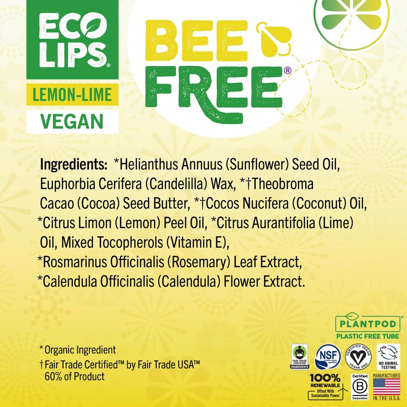 Our 100% beeswax-free vegan lip balm is made of candelilla wax, a plant-based wax with a soft and glossy consistency, certified organic Fair Trade Certified cocoa butter and coconut oil to leave your lips incredibly soft, hydrated and supple. With a touch of uplifting lemon-lime, this 3-pack of vegan Bee Free lip balm offers a nourishing pop of citrus flavor. Eco Lips has always been one step ahead of the game when it comes to product and package innovation, and we are proud to announce the launch of Plant Pod, our plastic-free, plant-based lip balm tube. Thanks to this groundbreaking technology, Eco Lips lip balms are now made from 100% plant material and can be disposed as general waste after use.
