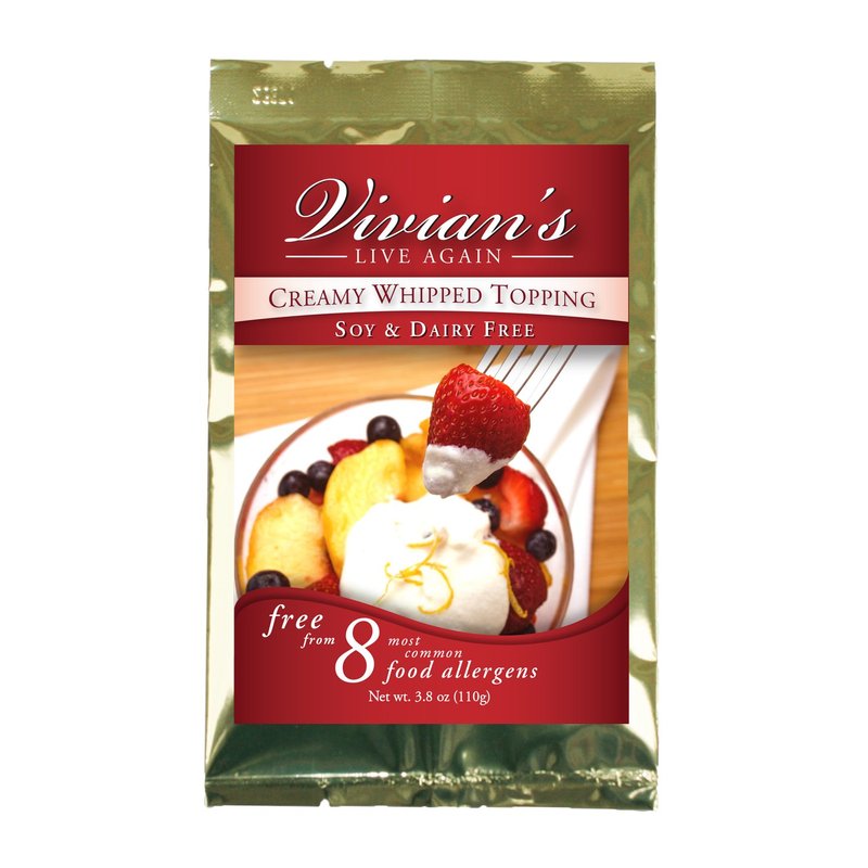 This vegan whipped cream replacement is unbelievably smooth and creamy. Each packet makes 2 1/2 cups topping and will not lose whip over time, staying light and fluffy for at least a week. Enjoy the creamy vanilla flavor of whipped topping without any Soy, Dairy, Gluten, Nut, Peanut, or Egg! Visit us online for recipe ideas and more!