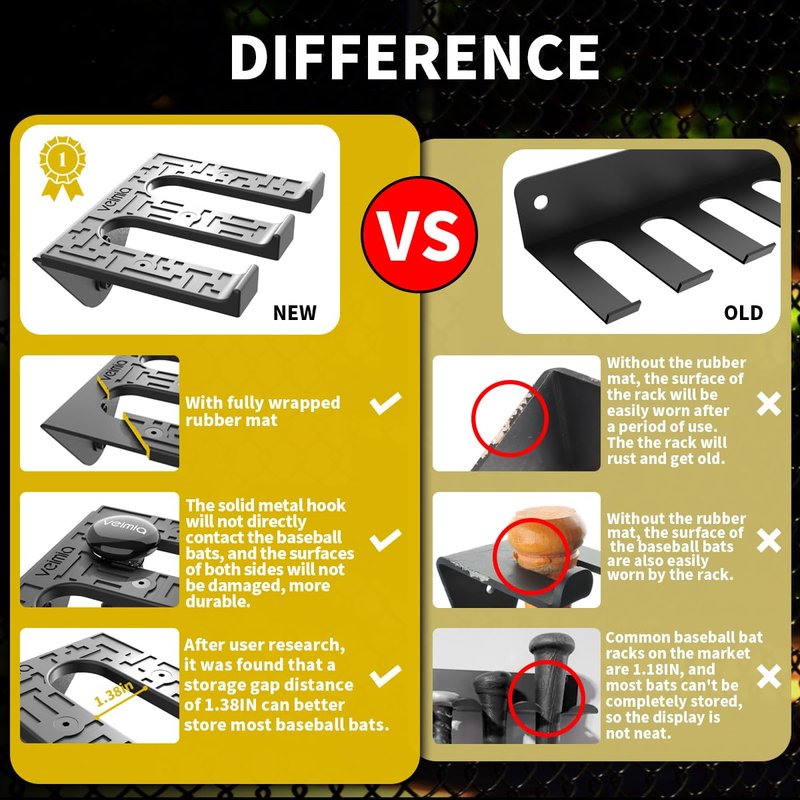 - [WHY TO BUY] Hard metal texture baseball bat storage rack can be firmly fixed on the wall. Special rubber mat design can avoid damage between baseball bat and rack due to collision.