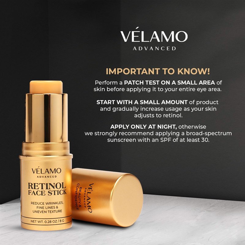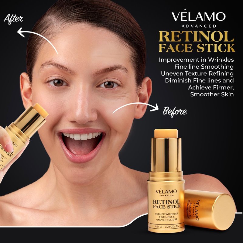 - The Retinol Face Stick for Fine Lines and Uneven Texture - VELAMO ADVANCED retinol face stick is a multi-treatment balm that smooths, brightens and tightens your skin. Our retinol cream for face works wonders as an anti-aging solution. This powerful and versatile facial skin care products visibly boosts bounce and moisture levels. Most importantly, our face moisturizer is gentle and safe for all skin types.