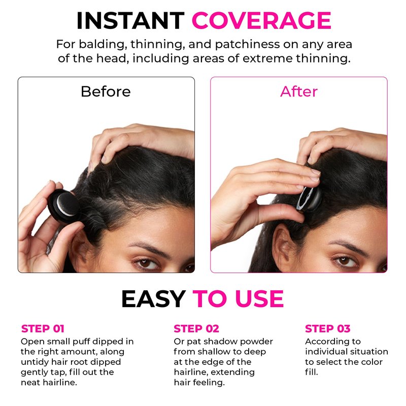 - Easy To Use: Unlike other hair toppers for women, hair fibers for thinning hair for women, and hair thickening products for women, VELO Hairline Powder makes it easy to cover thinning, root re-growth, bald spots and patchiness. 3 STEP: Mirror, Powder, Puff - Remove the film from the mirror, unfold the puff located at the bottom and dip it into the hair powder. Gently tap along the grey hairline roots to fill them with color, creating a tidy hairline. Alternatively, softly tap the hair powder from light to dark along the hairline's edge. You can also lightly pat with your fingers.