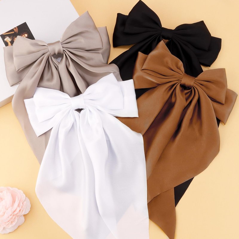 Velscrun Women Girls Hair Accessories Gifts - Khaki Satin Coquette Bow, White Silky Bow, Brown Oversized Hair Clip Ribbons, Black Long Tail Barrettes (4Pcs)
