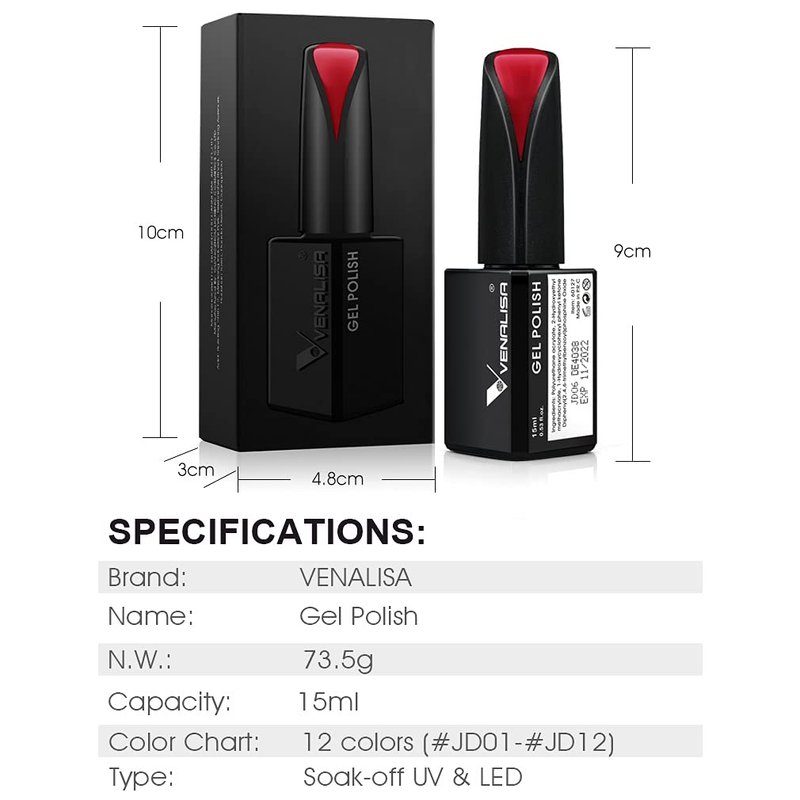 Features: ●VENALISA gel polish, fit for all occasions and seasons. ●Capacity upgrade: With big volume of each bottle 15ml, that enough for lots of fingernails/toenails art or sharing with your friends. ●High Glossy Professional Gel Nail Polish: Premium gel material bring you brilliant shine finish and more smoother than traditional polishes. ●Long Lasting : Will last up to 20 days with proper application. ●Safe & Eco-friendly Natural Gel Polish: VENALISA gel polishes are made from quality natural resins. ●100% Reliable Brand: VENALISA will always protect your beauty dream as we always do. How to use VENALISA Nail Gel Polish? Professional usage: Step 1. Clean Nails then trimming nail surface as normal manicures process. Step 2. Fully shake up the gel polish, it can make the gel polish color balanced. (Important) Step 3. Apply base coat first,which can make polish lasting longer, cure with UV lamp or LED lamp. (Necessary) Step 4. Apply first thin layer of color gel directly, cure with UV lamp for 2 minutes or cure with LED lamp for 60 seconds. Step 5. Apply second thin layer of color gel and then immediately cure with UV lamp for 2 minutes or cure with LED lamp for 60 seconds. Step 6. Apply top coat, cured by UV lamp or LED lamp. How to remove gel nail polish? Step 1. File off the top coat gently. Step 2. Soak cotton pad with acetone, then wrap around each nail tightly with tin foil, and leave it for around 10-15 mins. Step 3. Product will start to become soft and you can gently file it away or slide it off using a small wooden stick.