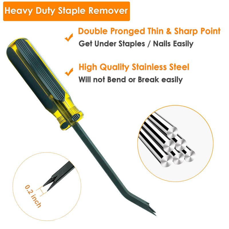 - Double Pronged Head Design: The upholstery staple remover is designed with ultra sharp double pronged tips, allows you to wedge under and pull out the deeply embedded staples or any stubborn fastners without damage the surface